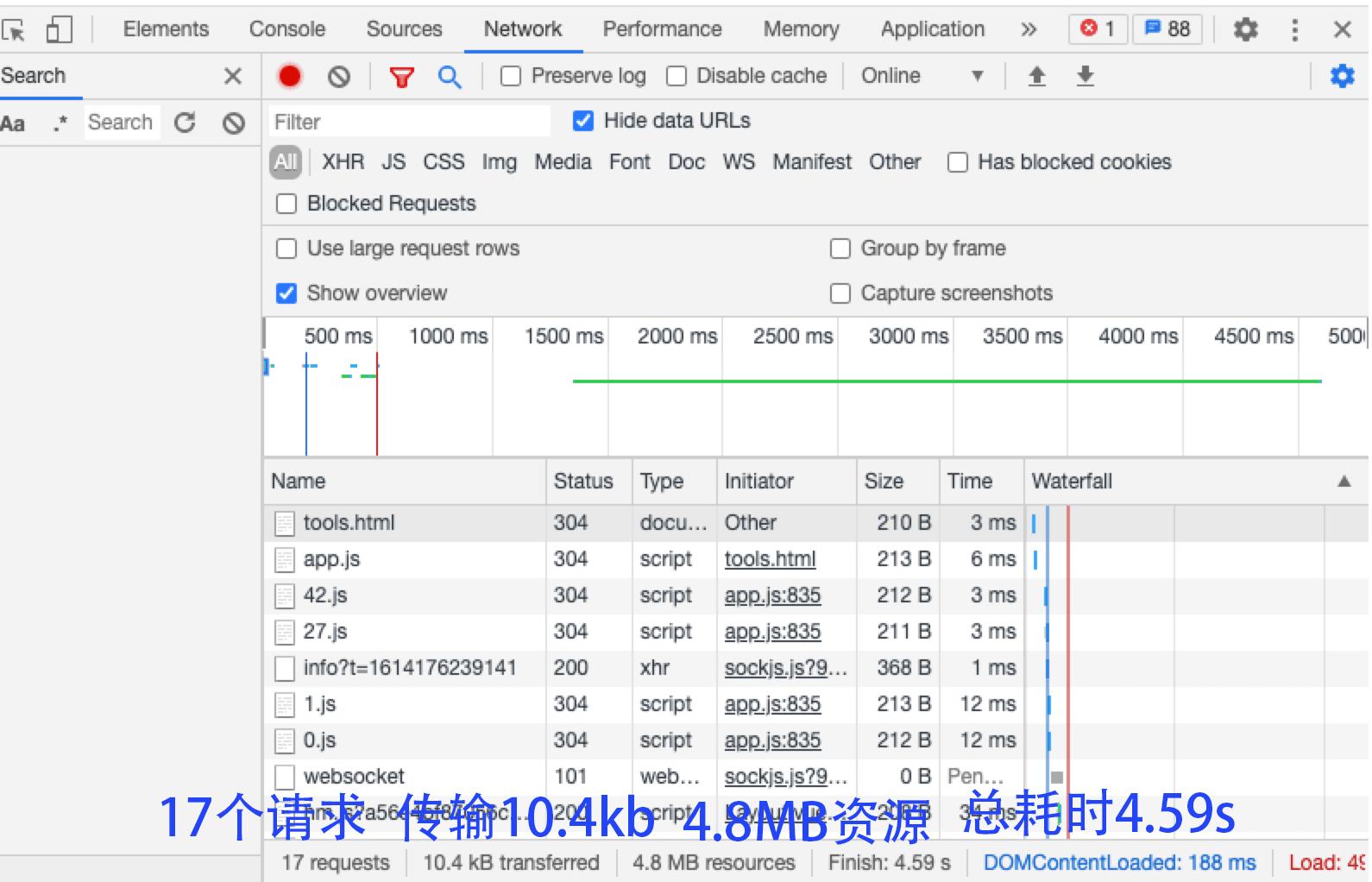 从上面可以看出页面有17个请求,其实并没有建立这么多的TCP/IP连接,所以有些请求在Connection Start阶段,没有DNS Lookupinitial connectionSSL的过程,因为不需要建立一个完整的TCP/IP连接,因为咱们的http2.0是多路复用的,第一个文件建立3次握手之后,可能第二个文件又不建了,这里面省了很多握手的时间。
