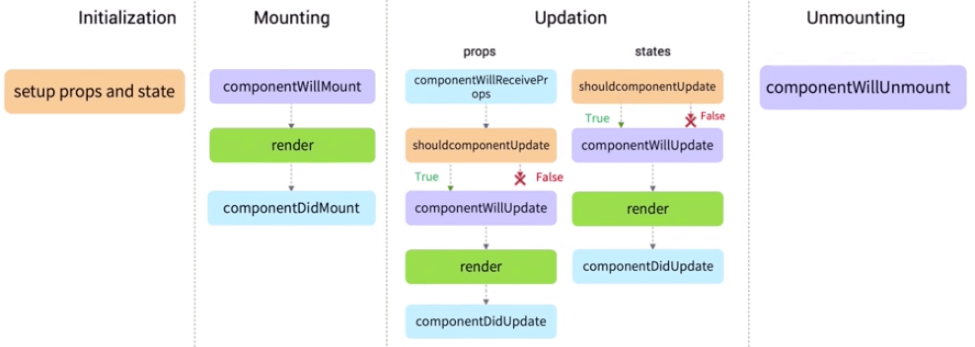 • componentWillUnmount 卸载函数,组件卸载及销毁之前直接调用,主要用于清除一些在组件生命周期订阅,真实DOM事件以及setTimeout/setinterval的返回值