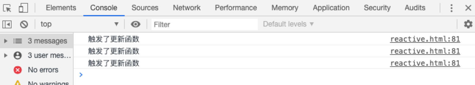 我们运行这段代码,看看我们更改2次data中数据会触发几次更新函数;下面显示更新了3次,第一次我们可以忽略,因为在watch函数中调用了一次,这是为了访问data函数中的name和age,从而触发它们的getter把更新函数添加Dep中去,其实触发2次很多人觉得没什么,但是我们更改多次模版中依赖的变量时候,每次都要diff对比,然后更新dom,显然是白白的性能浪费,现在我们想做的是我不管你操作几次模版中依赖的变量,我统一处理,一次diff对比!